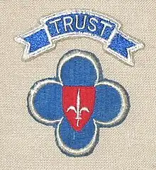 TRUST units, which included a number of 88th divisional support units, all bore a unit patch which was the coat of arms of the Free Territory of Trieste superimposed over the divisional quatrefoil, over which was a blue scroll containing the designation "TRUST" in white.