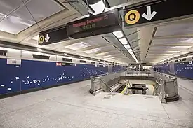 In 2009, MTA Arts & Design selected Sarah Sze from a pool of 300 potential artists to create the artwork for the station.[88][89] Her work, which was created by Spanish artisans Alcalagres,[89] consists of blue, violet, and lavender landscapes,[90][88] as well as depictions of wind blowing things around.[89] The artwork is located on 4,300 porcelain wall panels.[91][92][93] The installation is permanent.[94]