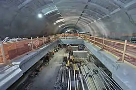In mid-2013, work had resumed in the tunnel segment between 99th Street and 105th Street, involving the addition of track and signals, mechanical and plumbing equipment, and upgrading the tunnels to meet modern fire code standards.[51][52] As of November 2013, the station was 65% excavated. Rails for the line had arrived and were being stored in the station cavern;[53] about one-third of the rails for the line had arrived by then, enough for tracks to be laid from 105th to 87th Streets.[54] By spring 2014, the mezzanine was completed, and roof slabs were being installed; tracks and signal brackets were also installed north of the station.[55] By April 2015, the station was 67% complete,[56] and by April 2016, the station was 91% complete.[57] The station was scheduled to be completed by June 2016,[58] but this was later pushed back to fall 2016.[59]