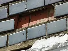 Two missing tiles show the structure of the top floors' cladding
