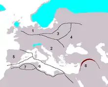 It is believed that European sites settled before 8500 were still Palaeolithic, or at best Mesolithic, communities. At Star Carr in North Yorkshire, the results of radiocarbon analysis in 2018 indicate that occupation first commenced between 9335 and 9275 BC, lasting for a period of around 800 years until 8525–8440 BC, although such occupations may have been episodic in nature, varying in intensity between different periods.[14] Archaeological excavations at Cramond in prehistoric Scotland have uncovered evidence of habitation dating to around 8500 BC.[15] Another settlement may have been established at Ærø in Denmark.[16]