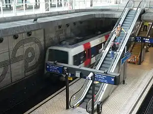 In 1991, airport managers and the Syndicat des transports Parisiens (the regional transit planning agency, now known as Île-de-France Mobilités) begin a project to connect the terminals and rail stations with an automated rail shuttle service. Construction of the system would take more than a decade, complicated by an aborted attempt to use a new train technology.[4] The CDGVAL (Charles de Gaulle Véhicule Automatique Léger, English: Charles de Gaulle light automatic vehicle) system finally opened on 4 April 2007, linking Terminal 1, parking lot PR, this station, Parking lot PX, and the TGV/RER station at Terminal 2.