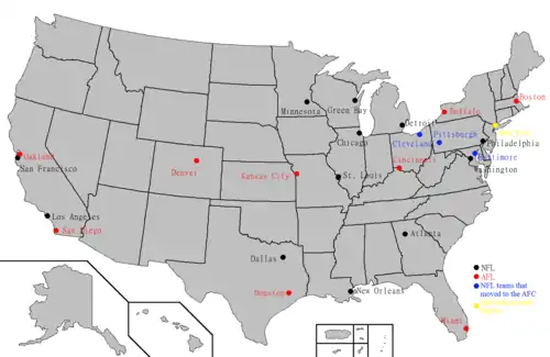 - Of the ten teams that competed in the AFL in 1969, seven have been continuously based in their 1969 market, one (the Raiders) returned to their original city after moving to a different city post-merger, one (the Oilers) no longer plays in their original city and one (the Chargers) has returned to its original AFL city after a relocation that took place before the merger. However, the Raiders moved a third time, leaving Oakland for Las Vegas in 2020.[35]