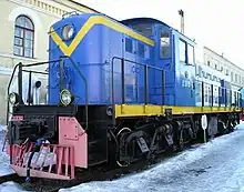 The Soviet-built TE1 (ТЭ1), initially designed TE1-20, was a reverse engineered copy of the Alco product, adapted to metric system and Soviet norms.[3] They were almost identical, but locomotives after #TE1-20-122 had 1050 mm (41.34 inch), instead of 40 inch wheels (1016 mm).[3] The designation meant T - teplovoz (diesel engine), E - electric transmission, model 1, 20 ton axle load.[3] A production lasted from 1947 until 1950 and 300 were made (including 2 of TE5 class).[3] The TE2 (ТЭ2) utilized engine and electric components of TE1, but was as a twin-unit version, with a wagon-type body and utilized two-axle bogies.[4] The TE5 (ТЭ5) was a cold climate version of the TE1. The cab was extended for most of the locomotive to provide covered access to the engine and a boiler was added to keep the cab warm when the engine was not running.[5] Only two (or five) TE5 were built, within TE1 series.[3]