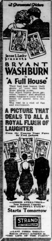 A Full House is a 1920 American silent comedy film directed by James Cruze and written by Alice Eyton based upon the 1915 Broadway play of the same name by Frederick J. Jackson.[1] The film stars Bryant Washburn, Lois Wilson, Guy Milham, Hazel Howell, Vera Lewis, and Beverly Travers. The film was released on October 24, 1920, by Paramount Pictures.[2] It is not known whether the film currently survives,[1] which suggests that it is a lost film.
