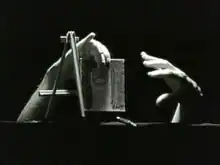 | Two pairs of magician hands, one red and the other blue, appear and do magic tricks. They use a glass of water and some playing cards to create the illusion of two of the same card appearing. | |||