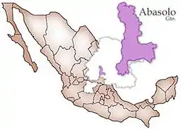 Abasolo is a Mexican city (and municipality) located in the Southwest region of the state of Guanajuato. The municipality has an area of 601.73 square kilometres (1.98% of the surface of the state), and is bordered to the north by Pueblo Nuevo and Valle de Santiago, to the south by the state of Michoacán and Huanímaro, and to the west by Pénjamo and Cuerámaro. The municipality had 79,093 inhabitants according to the 2005 census.[1][2] The city was estimated to have 28,100 inhabitants in 2020.[3]