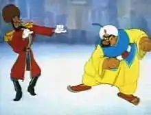 In this version, Abdul is depicted as a bully who picks on Ivan's dwarf friend, provoking Ivan into treading on the Turk's toe. He has many traits of 1930s and 1940s cartoon villains, such as Bluto, including thick lips, a beard and a big belly. There is a brief swordfight, which soon changes into a brawl, that ends with Ivan and Abdul literally "out cold", after falling through a frozen lake and emerging frozen in a pillar of ice thanks to Ivan's friend who planted a bomb on Abdul and it is unknown if they are being thawed or not. The relatively sympathetic depiction of the Russian character is unlikely to have had any connection to then-current world events, as the cartoon was in production in 1940, and was released in February 1941, before the invasion of the USSR by Nazi Germany, and before the alliance with the UK, in June 1941.
