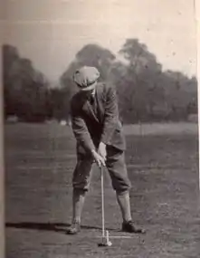 Mitchell, c. 1911, demonstrating proper fairway wood technique – notice the white perpendicular lines drawn to show correct ball placement in the stance.
