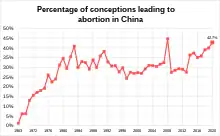 The abortion rate in China remained relatively low into the early 1960s, although it increased to 5.3% in 1958 and 8.4% in 1962.[9]: 98–99 Generally, research attributes those increases to the birth planning campaigns that occurred contemporaneously.[9]: 99