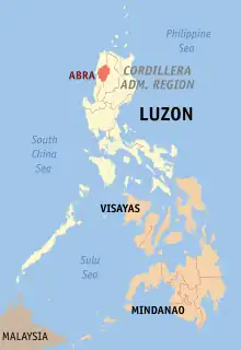 Abra's at-large congressional district refers to the lone congressional district of the Philippines in the province of Abra. Abra has been represented in the country's various national legislatures since 1898.[3] The first congressional delegation consisted of two members in the First Philippine Republic legislature known as the Malolos Congress. Since 1919 when it was re-established as a regular province separate from Ilocos Sur, Abra has been entitled to one member in the House of Representatives of the Philippines, elected provincewide at-large, except for a brief period between 1943 and 1944 when it was again represented by two members in the National Assembly of the Second Philippine Republic.[4] From 1978 to 1984, all provinces were converted into multi-seat regional at-large districts for the Interim Batasang Pambansa of the Fourth Philippine Republic, with Abra forming part of the twelve-seat Region I's at-large district. It was restored as a single-member district in 1984.[4]