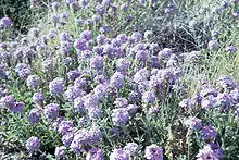 Abronia villosa is a short, hairy annual wildflower[2] which grows in creeping prostrate masses along the ground. It has oval-shaped dull green leaves and many peduncles bearing rounded inflorescences of bright magenta or purplish-pink flowers. It grows in the sand of the deserts and coastlines. It has a very sweet fragrance, and is also very sticky. They usually grow between February and May.