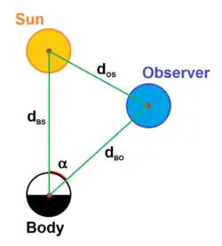 The phase angle can be calculated from the distances body-sun, observer-sun and observer-body, using the law of cosines.