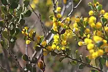 Acacia acoma is an erect, spindly, open or spreading shrub that typically grows to a height of 0.5–3 m (1 ft 8 in – 9 ft 10 in) and has smooth bark. Its phyllodes are variably-shaped, from narrowly oblong to elliptic or egg-shaped with the narrower end towards the base, mostly 15–30 mm (0.59–1.18 in) long and 7–12 mm (0.28–0.47 in) long and often sessile. The flowers are borne in a 2-headed raceme 0.5–1 mm (0.020–0.039 in) long on a peduncle 8–21 mm (0.31–0.83 in) long, the heads spherical, 5–6 mm (0.20–0.24 in) in diameter with 30 to 37 golden-yellow flowers. Flowering occurs from July to October, and the pods are strongly curved or spirally coiled, up to 15 mm (0.59 in) long when expanded and 2–3 mm (0.079–0.118 in) long, containing mottled black and yellowish green seeds 2.5–3.0 mm (0.098–0.118 in) long with a creamy-white conical aril.[3][4][5][6]
