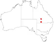 It has been found only in southern inland Queensland, from near Adavale and near Thargomindah on the slopes of red sand dunes and on alluvial soils in open shrubland.[5]
