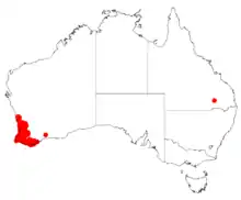 It has a scattered distribution from the west coast in the Wheatbelt region south through the Peel, South West and east into the Great Southern region.[3] Found as far north as Jurien and south to Albany it is usually part of open woodland, woodland and forest communities and sometimes occasionally in areas of shrubland. Often in found in winter wet depressions growing in sandy and loam lateritic soils.[2]