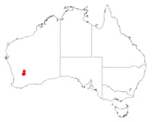 It is native to a small area in the Wheatbelt and Goldfields-Esperance regions of Western Australia where it is often situated on scree slopes of breakaways composed of granite.[1] The range of the plant exists within the Chiddarcooping Nature Reserve, located approximately 70 km (43 mi) north east of Merredin as a part of low scrub or open woodland communities.[2]