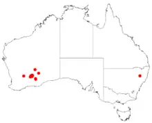 The shrub is native to an area in the Goldfields-Esperance regions of Western Australia but it has a scattered distribution. It is found between Norseman in the south and as far north as Leonora where it grows in red sandy loamy rocky soils[1] A calcarata is often part of open mallee scrub or tall shrubland communities.[2]