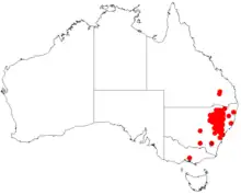 It is endemic to the north-western slopes of the Great Dividing Range and the north western plains of New South Wales and it also found in the Hunter Valley region where it is usually situated on stony or rocky hilltops and hillsides growing in skeletal or sandy soils. as a part of Eucalyptus woodland or scrubland communities.[2] It is found from around Murrurundi in the south to around the Warrumbungle Mountain and Pilliga Scrub in the west to around Torrington and Warialda in the north.[1]