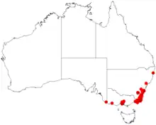 It is native to the states of New South Wales and Victoria, where it grows in granite-based soils as part of dry sclerophyll forest communities.[2]
