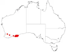 It is native to an area along the south coast of the Goldfields-Esperance region of Western Australia from around the east of Esperance at Cape Le Grand to east of Cape Arid National Park around Israelite Bay where it is found amongst granite outcrops growing in shallow skeletal soils with isolated populations around Pingelly.[1] It is also found on some islands on the Recherche Archipelago including Middle Island and Mondrain Island.[2]