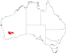 It is native to an area in the Goldfields-Esperance and the Wheatbelt regions of Western Australia where it is commonly situated on breakaways, among granite outcrops and on rocky rises growing in sandy or clay soils.[1] It is found in the Chiddarcooping Rock and Walyahmoning Rock areas near Bullabulling as a part of low Eucalyptus wandoo woodland communities and is often associated with other species of Acacia, Allocasuarina campestris and Melaleuca uncinata.[2]