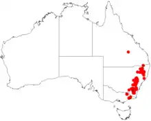 It is native to an area down the east coast from as far north as south east Queensland, New South Wales and north east Victoria in the south.[1] Found in open woodland and forests along the slopes and tableland areas. It is not widely cultivated but is quite hardy and suitable for a wide range of climates.[2]