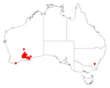 It is native to an area in the Goldfields-Esperance region of Western Australia where it is found amongst granite outcrops growing in skeletal sandy or loamy soils.[1] It has a scattered distribution from around Kambalda in the north to around Gilmore Rocks in the south and to Breeborinia Rock, about 100 km (62 mi) south of Balladonia in the east where it forms part of shrubland or mallee communities.[2]