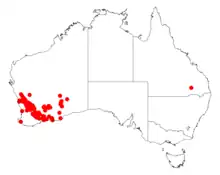 It is native to an area in the Wheatbelt and Goldfields regions of Western Australia where it is commonly situated on low ridges and rises or on sand plains growing in rocky, sandy or loamy soils often over or around areas of laterite.[1] The range of the plant extends from around Carnamah in the north west to around Cunerdin and Merredin in the south east where it considered to be reasonably common. Other populations are found around Holt Rock, near Boondi and along and on Ponton Creek near Zanthus in the east and is usually a part of scrubland composed of mallee Eucalyptus and other Acacia species.[2]