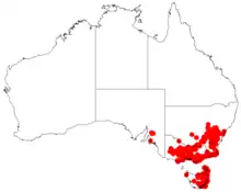 The shrub is endemic to south eastern New South Wales, eastern Victoria and eastern Tasmania as a part of open forest or heath communities.[2] The plants range extends from around Dubbo in the north down through the Australian Capital Territory to the Grampians in Victoria. The species is more common in north eastern Tasmania including Bruny and Flinders Islands. It grows in many different types of soils at an altitude of less than 1,000 m (3,300 ft) as a part of dry sclerophyll forest or heathland communities.[3]