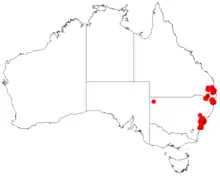 It has a disjunct distribution and is found around the Sydney area in New South Wales and further north from Coffs Harbour and inland to Torrington to the border with Queensland from the north as far as Crows Nest and Brisbane where it is a part of Eucalyptus woodland communities growing in shallow soils over granite and sandstone.[2]