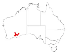 It has a scattered distribution in the Goldfields-Esperance region of Western Australia from around Mount Malcolm in the Fraser Range in the east past Norseman in the west and to the south around Peak Charles National Park. It is often found around granite boulders and outcrops and salt lakes growing in sandy and loamy soils[1] usually as a part of open Eucalyptus woodland or mallee communities.[2]
