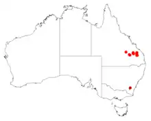 The shrub has a limited distribution in the central region of Queensland to the south of Theodore in the Isla Gorge National Park where it is found on hillsides, ridge tops and other places growing in sandstone based soils as a part of open Eucalyptus woodland communities.[1] It is found in and around the Isla Gorge National Park, Precipice National Park, Expedition National Park, Carnarvon Gorge National Park, Coominglah State Forest the small town of Widbury. There are around nine populations in Isla Gorge National, Park with some forming dense stands, it is also considered quite common in Precipice National Park and around Widbury. It is often associated with Acacia hockingsii, Eucalyptus decorticans, Eucalyptus exserta, Eucalyptus cloeziana, Corymbia trachyphloia, Eucalyptus dura, Lysicarpus angustifolia and Corymbia watsoniana.[2]