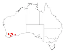 It is native to an area in the Wheatbelt, Great Southern and Goldfields-Esperance regions of Western Australia where it is found growing in sandy to loamy soils.[1] It has a scattered distribution from around Pingelly in the north west and near Ongerup in the south.[2]