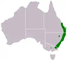 In the Australian state of Victoria it is listed as being an endangered species,[8] however it is a common species through much of the rest of its range.[4] The tree has a lifespan of more than 30 years.[9] It grows approximately 1 m per year.[10] It is frost tolerant down to −7 °C (19 °F),[11] but it is not drought tolerant, so irrigation may be necessary in some growing areas.[6] In its natural range, it tends to grow in places with an average maximum temperature of about 25 °C, but it also exists in a range of 22–32 °C avg. max. temp.[12] It tends to grow primarily in areas near the coast averaging 1200–1600 mm/year of rainfall, but overall it is found to some extent in an areas ranging 600–2000 mm/year of rainfall.[12]