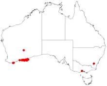 It is often situated on coastal sand dunes, on granite hills and among rocks growing in grey or white sandy soils along the south coast of Western Australia in the Goldfields-Esperance regions.[1] The bulk of the population extends from around Barker Inlet, about 50 km (31 mi) west of Esperance in the west out to around Israelite Bay in the east and extending inland to near Howick Hill, and is also found on several islands in the Recherche Archipelago usually as a part of heath and scrub communities.[2]