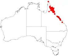 It is found in tropical areas of Australis and South East Asia including Flores in Indonesia and in Timor. It is found in areas close to the coast in Far North Queensland and north east Queensland in several disjunct populations. It is found from sea level to altitudes of about 500 m (1,600 ft) and is situated in a variety of habitats including beaches, in open forest and along creeks and water courses and less frequently on the margins of monsoon forest and dry rain forest.[1]