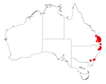 It is found in parts of north eastern New South Wales from around Bellingen and Coff Harbour in the south extending northward into south eastern Queensland. It is found in a variety of habitat growing in gravelly, clay and sandy to loamy soils as a part of wet sclerophyll forest and rainforest communities.[1] Its range extends from around Maryborough in the north down to around Stanmore in the south where it is situated in coastal areas with a high rainfall and low altitudes.[2]