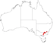 Its distribution is limited to a small area on the border between south-eastern New South Wales and north-eastern Victoria.[6] In New South Wales it is found along the southern edge of Woomargama National Park and has an estimated population of 2000 plants. In Victoria it is found in the Burrowa-Pine Mountain National Park from two stands east of the summit of Pine Mountain with nine plants in one stand and between 150 and 250 in the other. The Victorian populations are located approximately 35 km (22 mi) from the New South Wales populations.[1]