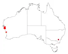 It is native to an area between Northampton and Shark Bay in the Mid West region of Western Australia where it is found on sand plains and sandhills growing in sandy clay soils over limestone or laterite.[1] The shrub is usually part of a heath or shrubland communities.[2]