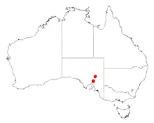 It has a disjunct distribution and is known in two areas that are situated approximately 150 km (93 mi) apart in the Flinders Range in South Australia. It is found around Brachina Gorge and Wilpena Pound in the north and around Nectar Brook on the Winninowie Range in the south. It is often situated on rocky ridgetops as a part of mallee communities over spinifex grassland or in Callitris pine communities.[1]