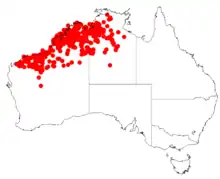 A. tumida has a range that extends from the Kimberley, Pilbara and north eastern Goldfields regions of Western Australia including much of the Great Sandy Desert. It also extends into the Victoria River district of the Northern Territory.[4] It grows well in sandplain areas in red sandy or pindan soils over sandstone.[2] They often form dense thickets with spinifex.