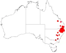 It is native to south eastern Queensland and north eastern New South Wales. In New South Wales it is found to the north of Corindi Beach and the Northern Tablelands from around Armidale and the north western slopes around Howell where it is found growing in stony and sandy soils over and around areas of granite and sandstone as a part of open Eucalyptus forests and woodlands and heathsland communities.[4]
