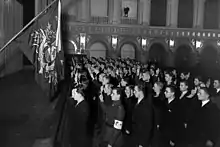 Members of the AKS were sworn in before the black flag. From 1923, oaths were held twice a year, on Day of the Finnish Identity and Independence Day. In the spring of 1924, an oath was also introduced, which, in addition to the flag, became the AKS' second main rite.[1]