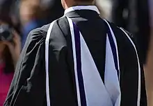 Imperial DSc recipients wear a similar gown but with the sleeves lined with white watered silk and held back with purple twisted cords and buttons.[6] Their hat is a purple velvet Tudor bonnet with white cord and tassel.[7]