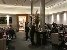 The restaurant served five- and ten-course tasting menus,[6][7] as well as "upscale" contemporary American cuisine such as cheeseburgers, lobster rolls,[8] lobster pot pie and a Wagyu steak dinner.[9] The dishes on its menu were often heavy and rich. Writing for Time Out, Julia Kramer noted the relative affordability of its prices compared to similar restaurants.[4]