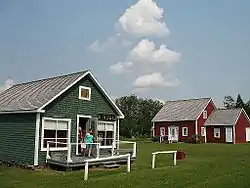 In addition to a split-log visitor center built in 1976, the museum includes five wood-frame structures built in the mid-19th century: three houses, a schoolhouse, and a blacksmith's shop. The church, a rough log structure also built in 1976, is a reproduction of a typical 18th-century Acadian church. All of the buildings are either one or 1+1⁄2 stories in height, with gabled roofs. They are built using either log construction or wood framing. The Morneault House, for example, is a log structure with the logs exposed inside, and is finished on the outside with clapboards. It served as an early post office in the region. The Village Schoolhouse is a wood-frame structure, built in 1875, and is also finished with clapboards.[2] It was originally located in Hamlin, and is believed to be the oldest schoolhouse in the region.[3]