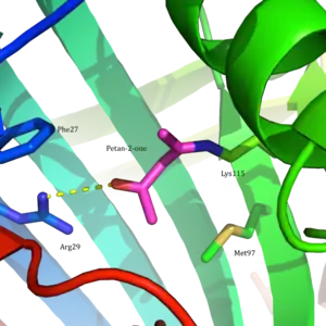 Crystal structure of acetoacetate decarboxylase in complex with an inhibitor, pentan-2-one. Using the residue Lys115, this inhibitor forms an acetyl acetone Schiff base intermediate. Mostly hydrophobic residues, such as Met 97 and Phe27, are found in the active site. This image was generated using PyMOL, from PDB ID 3BH3.[8]
