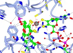 grey = W, yellow = sulfur, red = O, blue = N. The octahedral active site of the tungstoenzyme coordinated by two molybdopterin co-factors, Cys141 and a water molecule. The active site residues are Asp13 and Cys12.