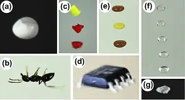 A selection of acoustically Levitated Objects in a TinyLev including solids, liquids, an ant and an electrical component. All in the size range of 2 mm-6 mm.[12]